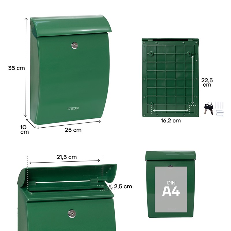 - PARA CORREO DIN A4 Y REVISTAS: con capacidad para correo tamaño DIN A4. Caben en posición vertical revistas, catálogos y hojas A4 sin doblar. La puerta al abrirse se detiene a 80 grados, pudiendo recoger el correo sin que se caiga.