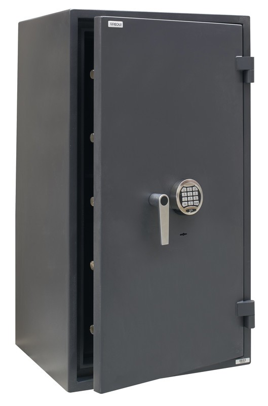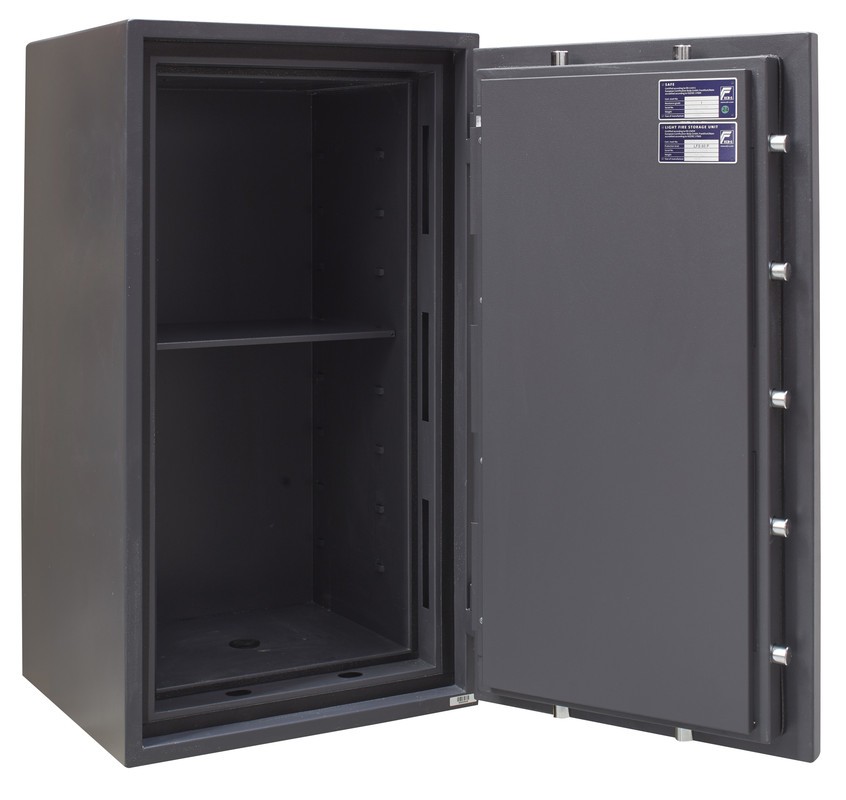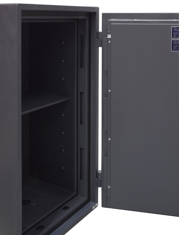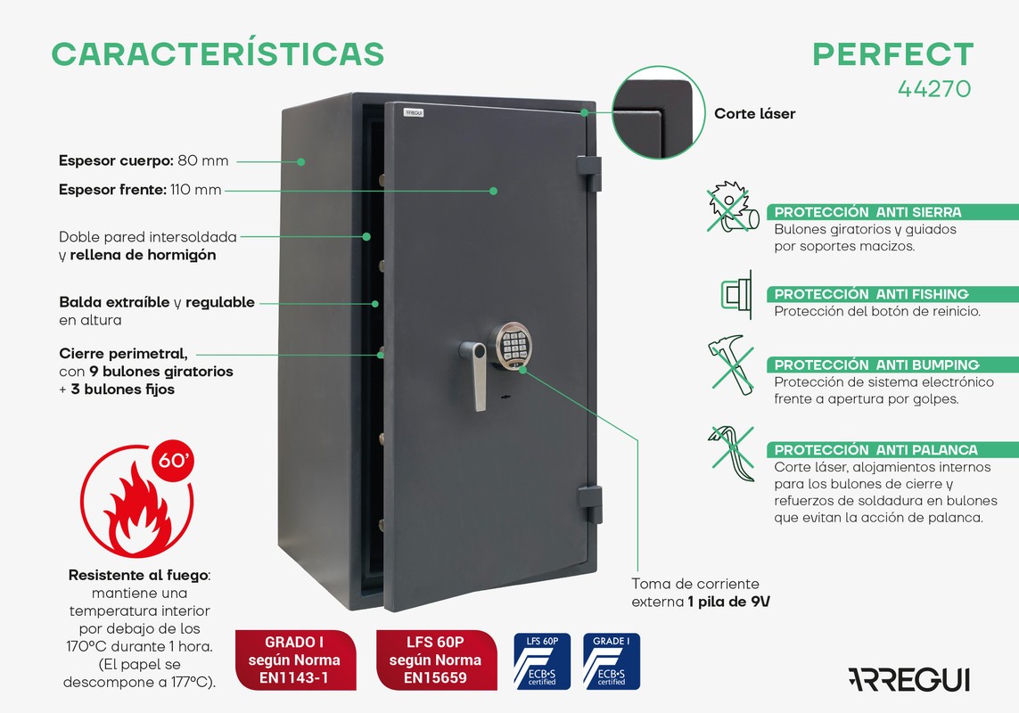 Caja fuerte de muy alta seguridad frente al robo (certificada en Grado 1 según Norma Europea EN 1143-1) y alta resistencia ignífuga (certificada LFS 60P según Norma Europea EN 15659).