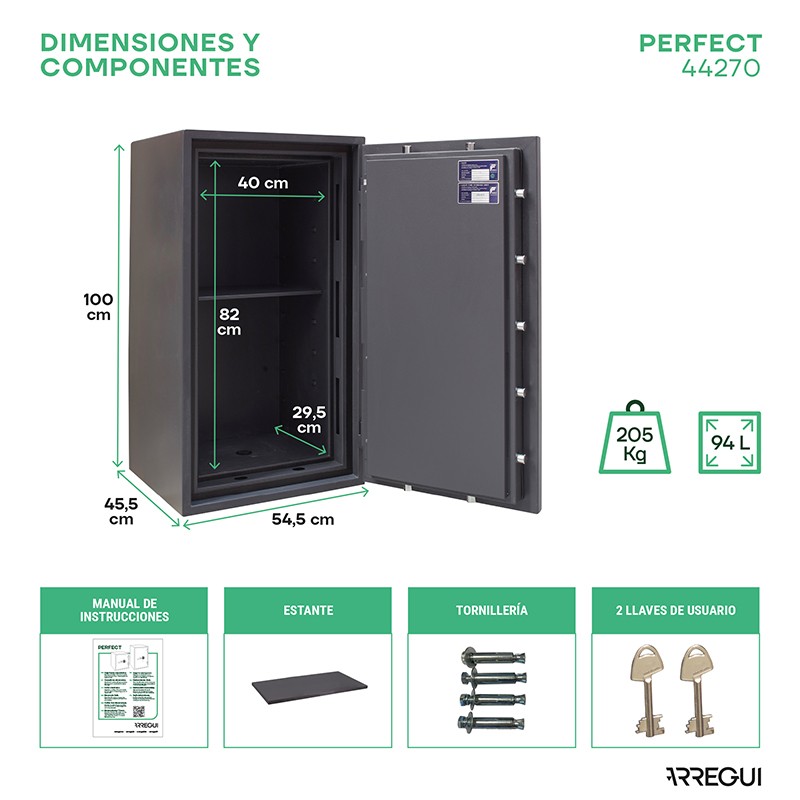 En el paquete se suministra la caja fuerte, el manual de instrucciones, 2 llaves de usuario y la tornillería de fijación.
