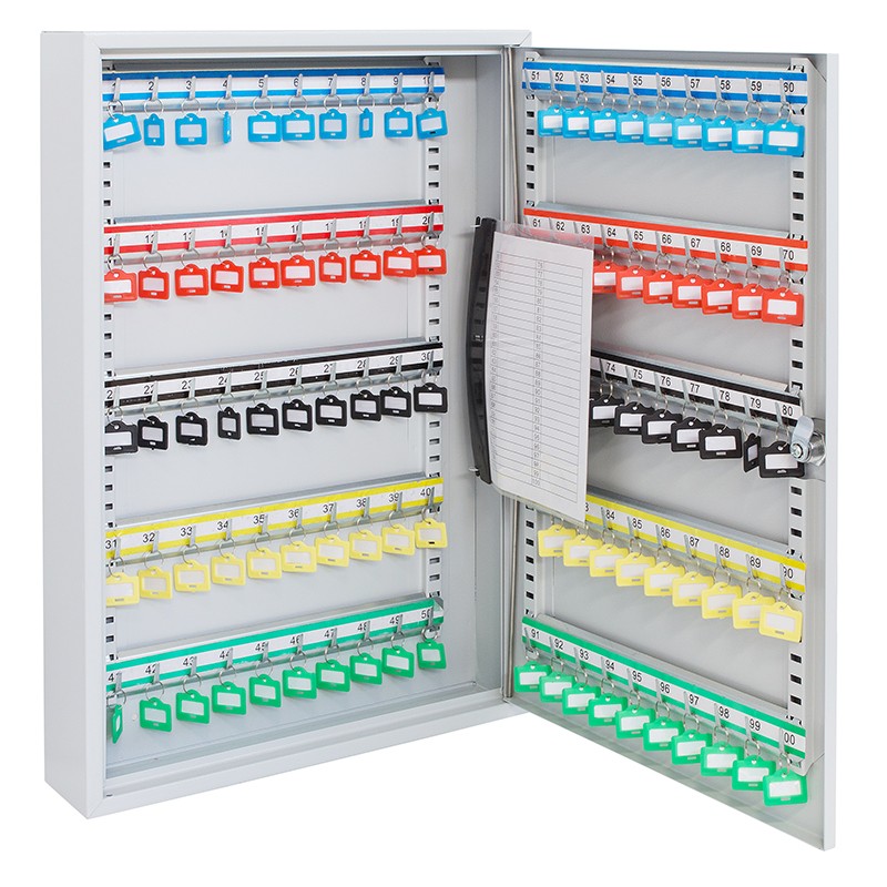 - ARMARIO DE SEGURIDAD: fabricado en acero con capacidad para 100 llaves. Incluye los llaveros de plástico con etiquetas para identificar las llaves, así como una funda portadocumentos interior.